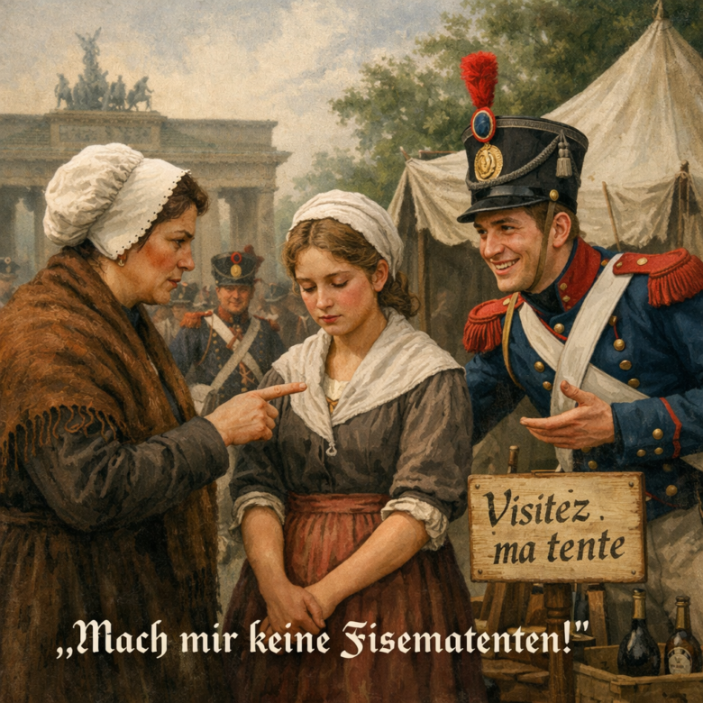 Der Platz vor dem Brandenburger Tor war voller fremder Stimmen. Französisch klang jetzt alltäglich in Berlin, fast so alltäglich wie das Knirschen der Stiefel auf dem Sand. Die Zelte der Besatzer standen ordentlich in Reih und Glied, als wollten sie beweisen, dass auch eine Fremdherrschaft geschniegelt auftreten konnte. An einem der Zelte hing ein Schild: …